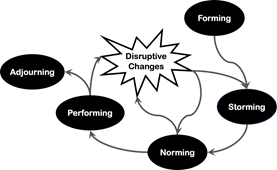 For example, if the group is performing at a high level for a considerable amount of time and a change of leadership happens (that reason itself could be a source of disruption as well). If the team is small, let’s say a team leader with two or three reporting staff, then most certainly a Forming stage can be identified, new relationships need to be established and uncertainty needs to be clarified. Possibly different rules will be implemented by the new leader and new processes will be agreed upon.