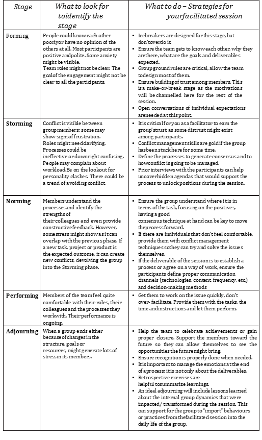 When preparing for a facilitated session, the facilitator and the team leader/ manager/ sponsor need to understand where the group is in terms of its development stages (Forming-Storming-Norming-Performing-Adjourning). This can be the key to a successful design and can have a lasting impact on the development of the team.