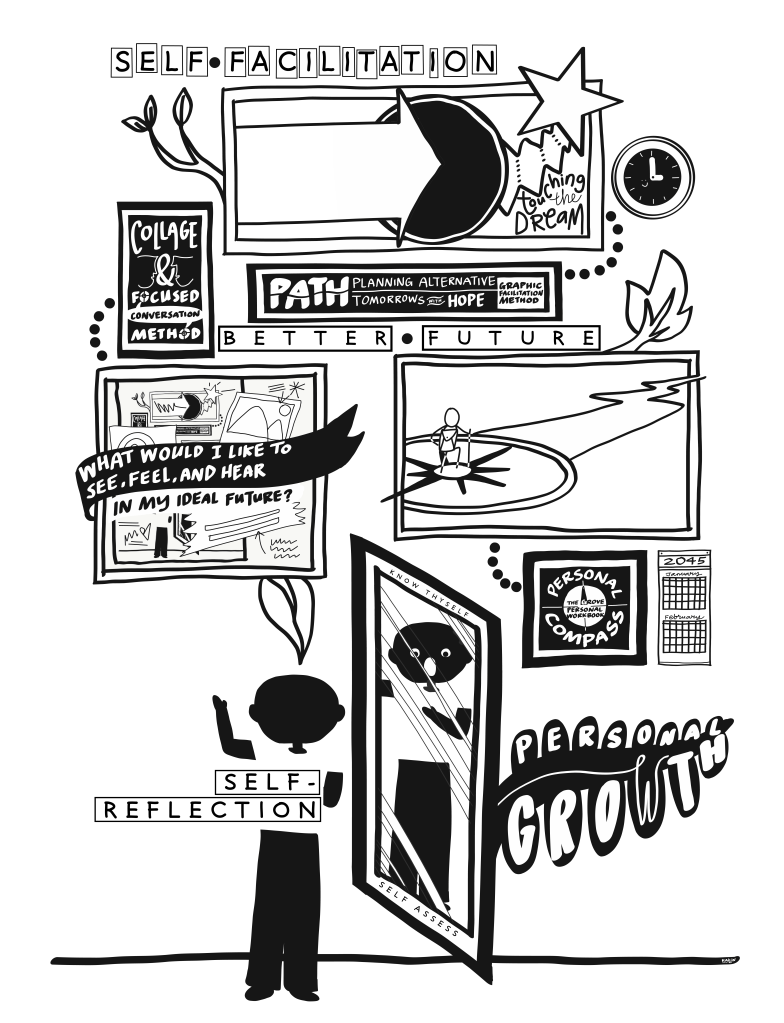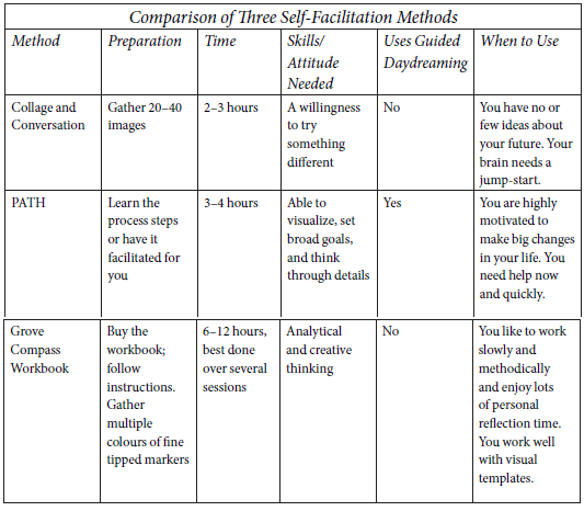 Each of these techniques are used by process facilitators. As group facilitators, we may use them differently. For example, facilitators may do a group collage for visioning, or have the group draw pictures and then tell stories of their future. We may use much bigger templates that cover a full wall for a group PATH and a Compass workbook type of activity. But as I hope to have shown, they work very well for individuals and for groups.