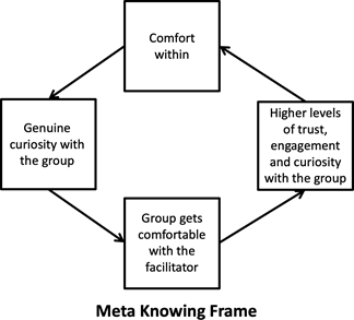 Rajvel brought out another dimension. “Compassion with people and self is important. This is about being very human. One is human and will make mistakes.” To view everything with compassion frees people up to speak their view and not look to orchestrate results. It is a process. And it begins with the leader and their compassion and acceptance of themselves. The power of facilitation, therefore, resides in sensing and harnessing the energy of the group. This requires a minute-by-minute presence, each minute not knowing what the next will beget. Knowing this frees up the facilitator to draw upon all of the groups resources. This is “meta knowing”.