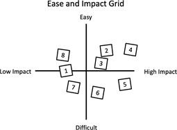An ease and impact grid is a prioritising and decision-making tool that assists people to manage their time more efficiently. An organization, team or individual assesses activities or possible solutions based on how easy the task may be and the potential impact or benefits it will have.